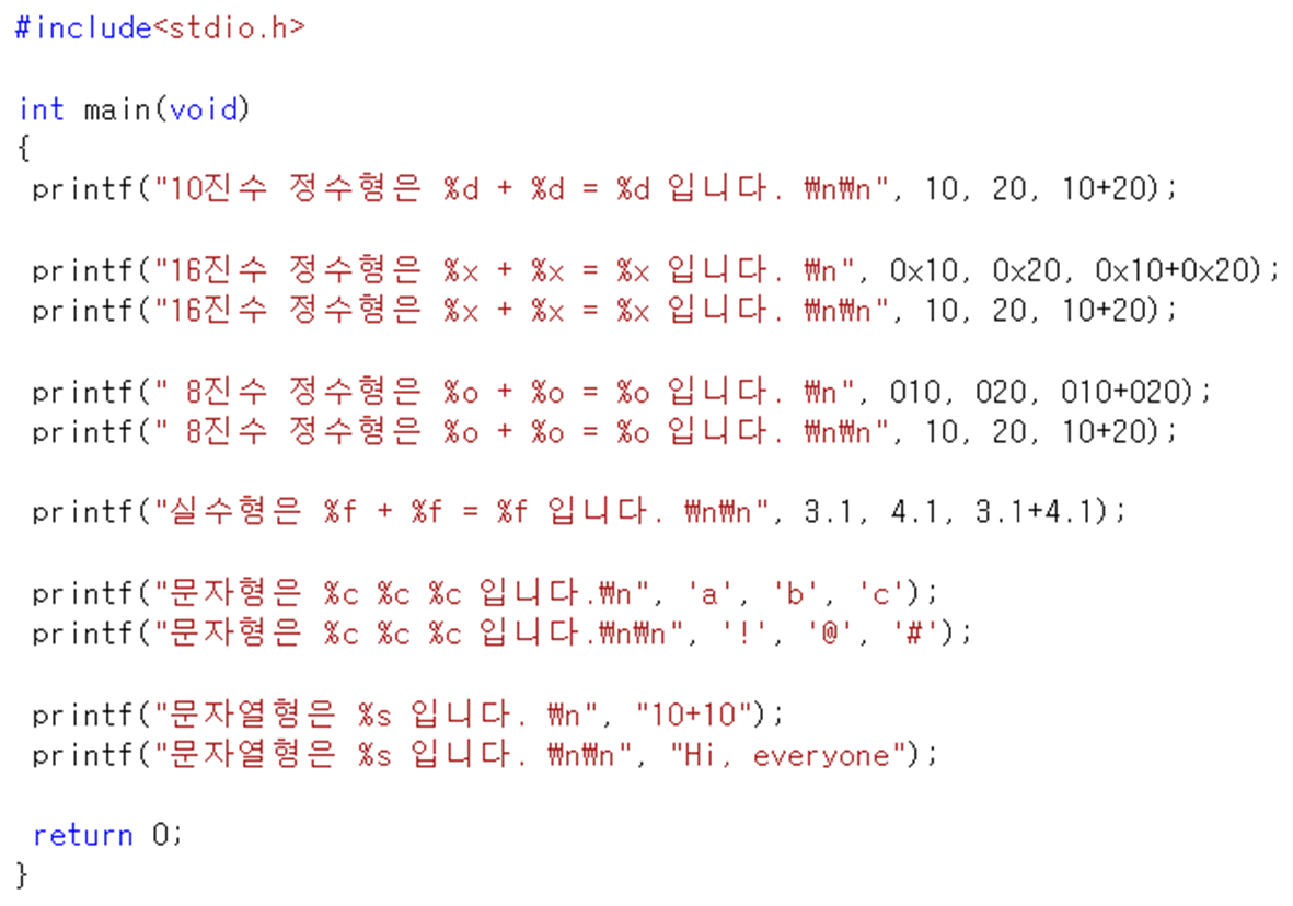 2-1. 아래의 코드를 입력한 후에 파일이름을 'printf1.c'로 저장한 후 실행해보세요.